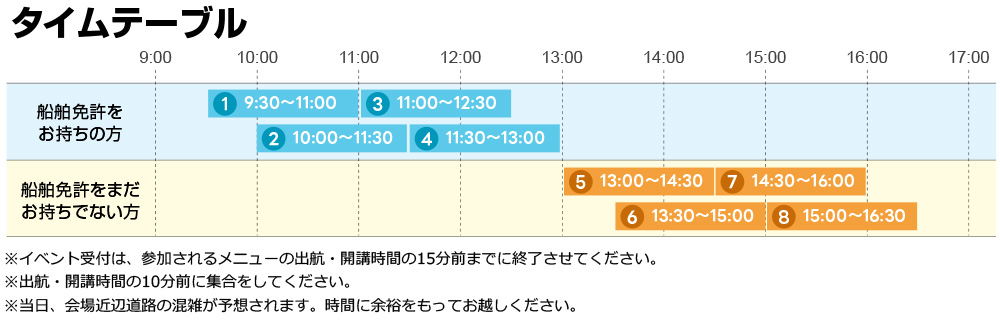 | 時間 | (1)9:30~11:00 (2)10:00~11:30 (3)11:00~12:30 (4)11:30~13:00 (5)13:00~14:30 (6)13:30~15:00 (7)14:30~16:00 (8)15:00~16:30 ※各回ごとの15分前までに受付をお願いいたします。ご来場いただきましたら、はじめにマリーナカウンターまでお越しください。 |